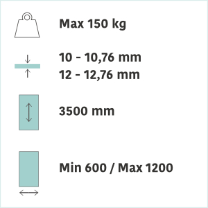 L’ innovativo sistema di pinze a pressione racchiuse in un unico fascione in alluminio permette di accogliere vetri con spessori 10-10,76-12-12,76 senza effettuare lavorazioni sul vetro.